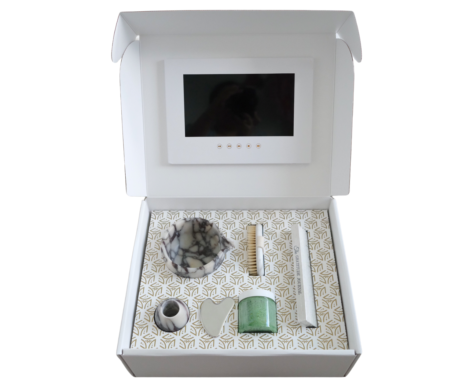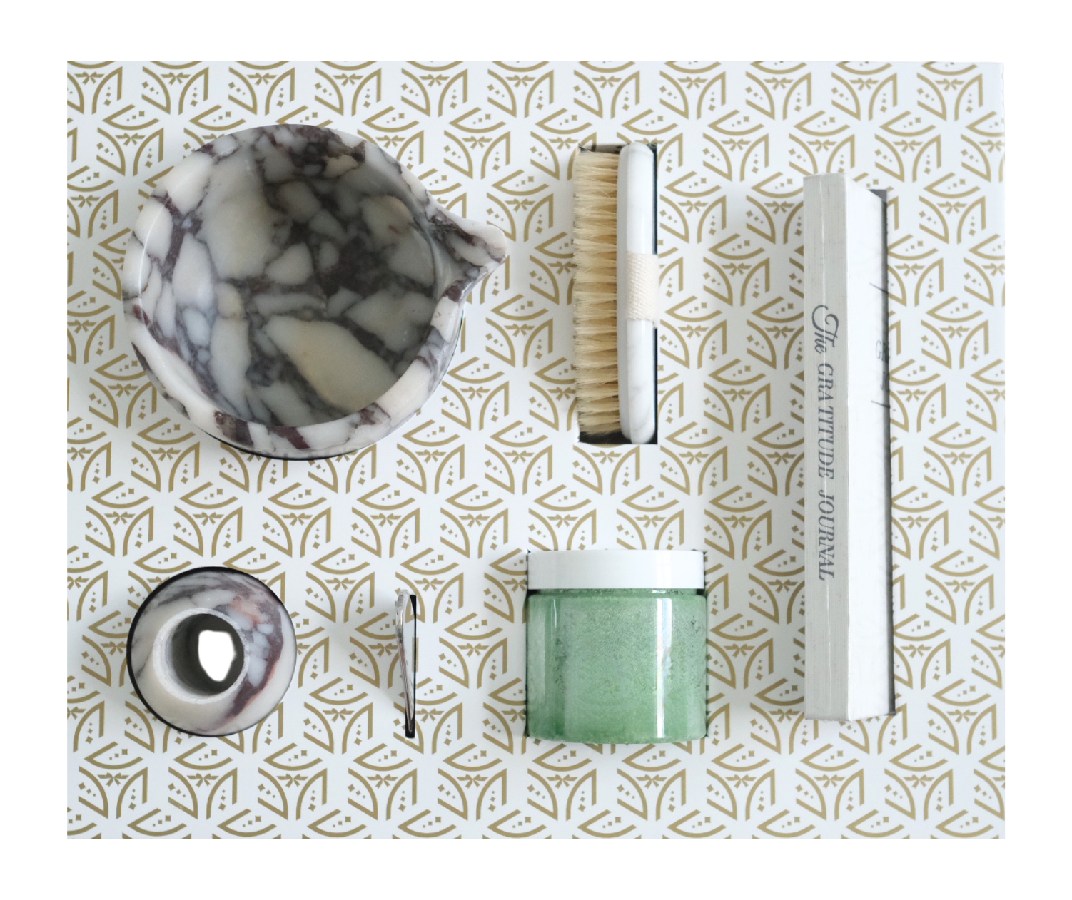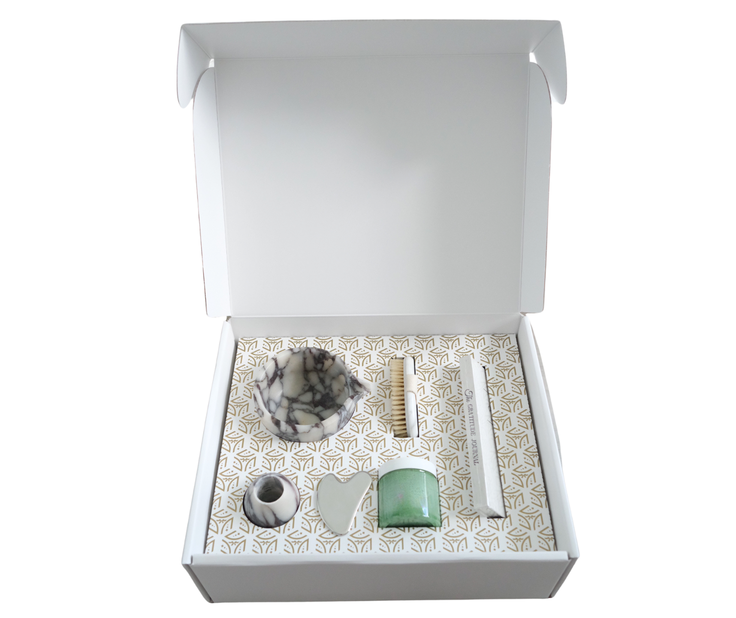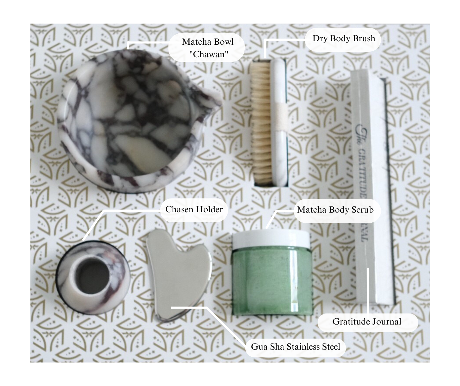 Elevate your wellness routine with this luxurious matcha self-care set, designed for relaxation and rejuvenation. Featuring a handcrafted Calacata Violla marble matcha chawan (bowl), chasen (whisk) holder, gua sha , dry body brush, gratitude journal, and a matcha body scrub, this set offers the perfect blend of mindfulness and indulgence. Treat yourself or gift someone special the ultimate self-care experience.