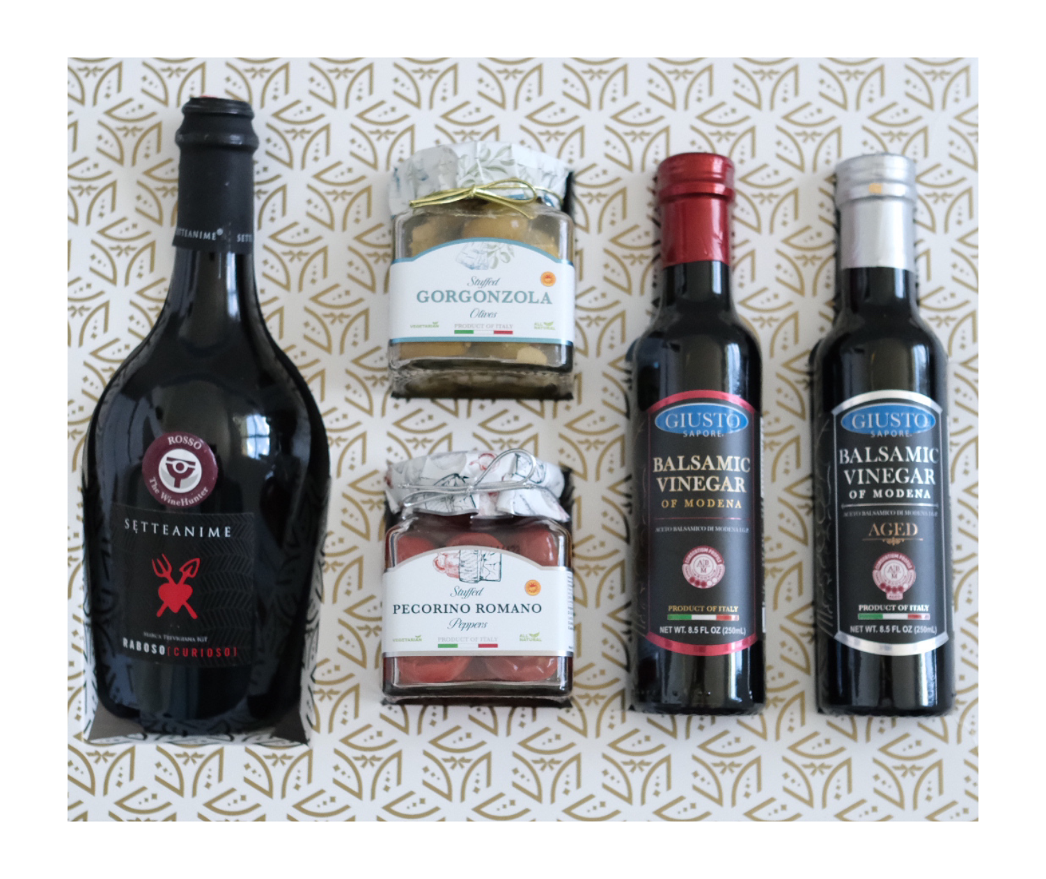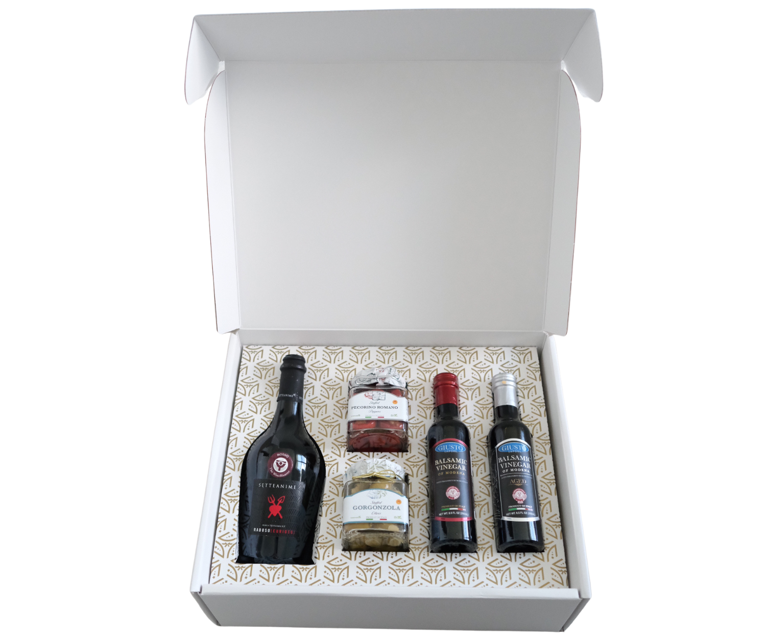 This set features a bold Setteanime Raboso wine, two premium Balsamic Vinegars, and a selection of rich, flavorful cheeses—featuring Gorgonzola-stuffed olives and Pecorino Romano-stuffed peppers.